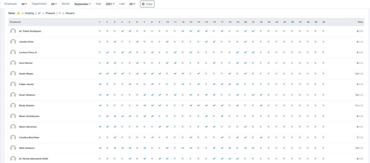 The member-view format holds the detailed view of individuals’ attendance including the track record for total working days, present days, late days, half days, absent days, and holidays. These can be viewed for employees one by one by selecting their details from the top section. This also offers a section on the top left corner for manual marking of attendance wherein the clock-in and clock-out time can be recorded that is visible in the member-view list format as well.